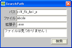 '================================================================ '= ファイルやフォルダの検索 '= (SearchPath.bas) '================================================================ #include "Windows.bi" ' ファイルやフォルダを検索する Declare Function Api_SearchPath& Lib "Kernel32" Alias "SearchPathA" (ByVal lpPath$, ByVal lpFileName$, ByVal lpExtension$, ByVal nBufferLength&, ByVal lpBuffer$, ByVal lpFilePart$) #define MAX_PATH 260 #define vbNullString ByVal 0 '値0の文字列。値0を持つ文字列。空文字列ではない Var Shared Text(2) As Object Var Shared Edit(3) As Object Var Shared Button1 As Object For i = 0 To 3 If i < 3 Then Text(i).Attach GetDlgItem("Text" & Trim$(Str$(i + 1))) : Text(i).SetFontSize 14 Edit(i).Attach GetDlgItem("Edit" & Trim$(Str$(i + 1))) : Edit(i).SetFontSize 14 Next Button1.Attach GetDlgItem("Button1") : Button1.SetFontSize 14 '================================================================ '= '================================================================ Declare Sub Button1_on edecl () Sub Button1_on() Var Path As String Var FileName As String Var Extension As String Var FullPath As String Var Ret As Long Path = Edit(0).GetWindowText FileName = Edit(1).GetWindowText Extension = Edit(2).GetWindowText FullPath = Space$(MAX_PATH) If Path = "" And Extension = "" Then Ret = Api_SearchPath(vbNullString, FileName, vbNullString, MAX_PATH, FullPath, vbNullString) Else Ret = Api_SearchPath(Path, FileName, Extension, MAX_PATH, FullPath, vbNullString) End If If Ret = 0 Then Edit(3).SetWindowText "ファイルは見つかりません!" Else Edit(3).SetWindowText FullPath End If End Sub '================================================================ '= '================================================================ While 1 WaitEvent Wend Stop End
